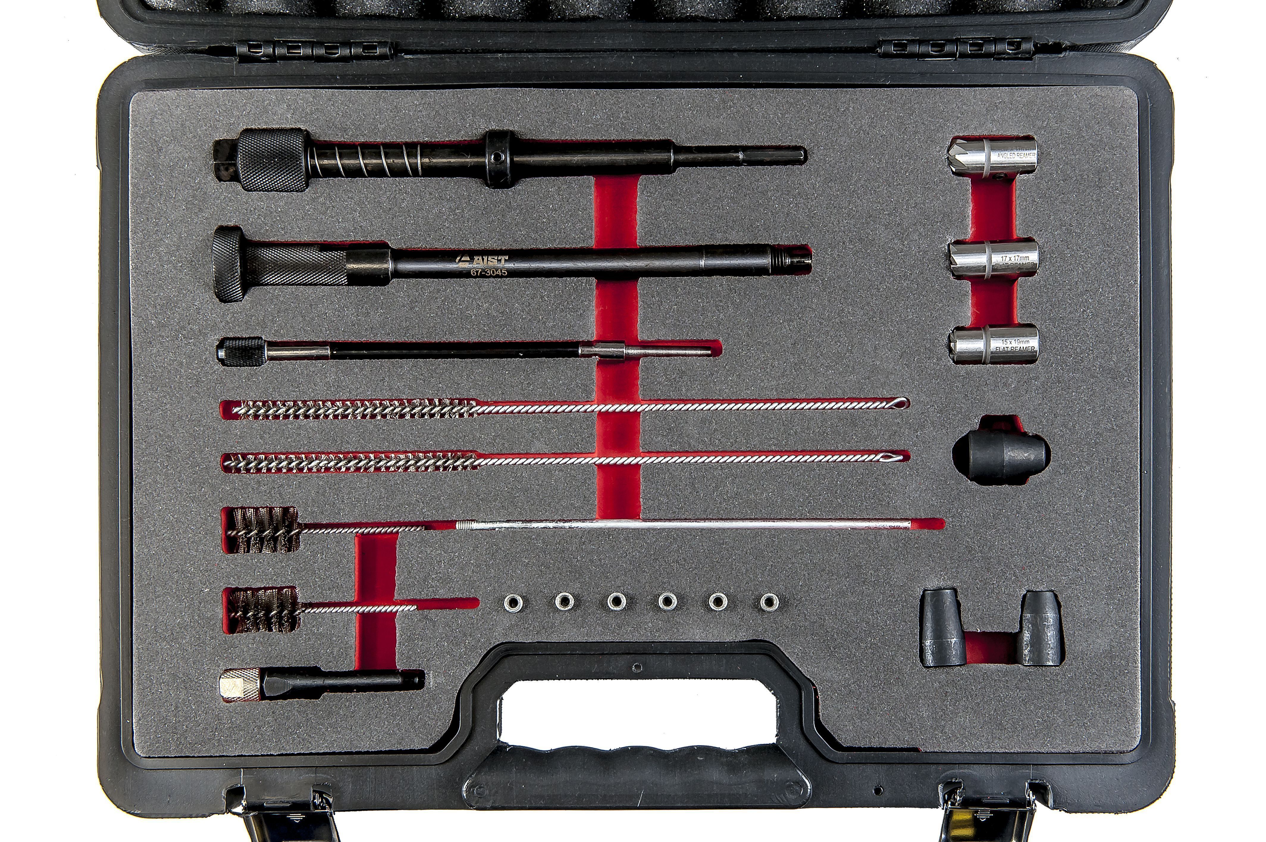 В комплекте набора есть универсальный съёмник уплотнительных шайб, ерши и фрезы для чистки посадочных мест под распылители форсунок, а также фрезы со ступенчатым профилем зуба 120° Ø 21 мм, 17 мм и фрезы с постоянным профилем 0° Ø 15, 17, 19 мм.