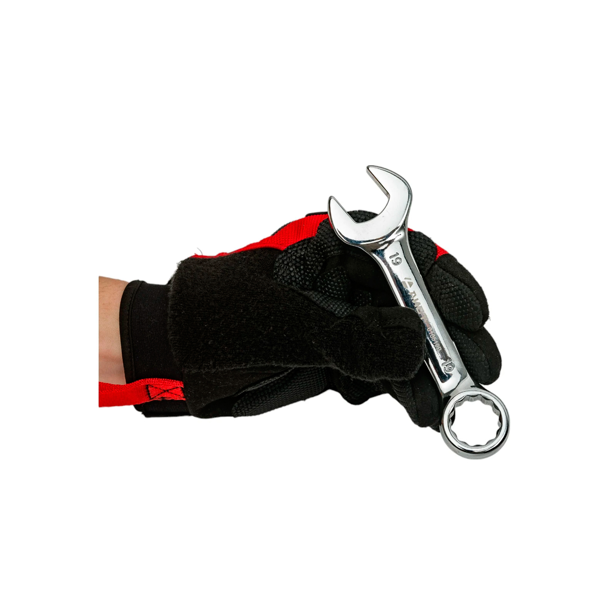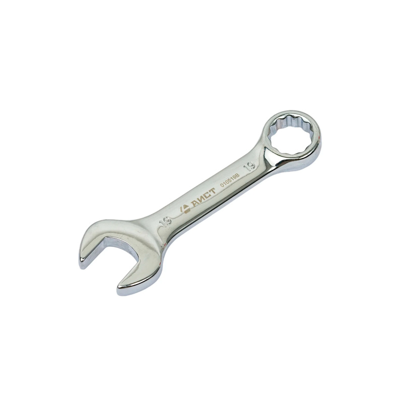 С одной стороны короткий комбинированный ключ 19 мм имеет рожковый профиль, а с другой двенадцатигранный накидной. Использование двух одноразмерных профилей делает инструмент универсальным для работы с крепежом.