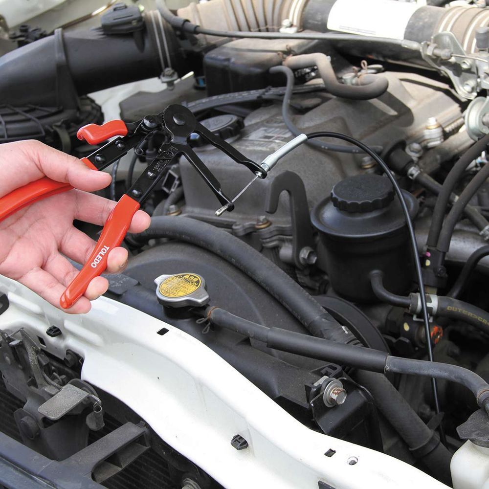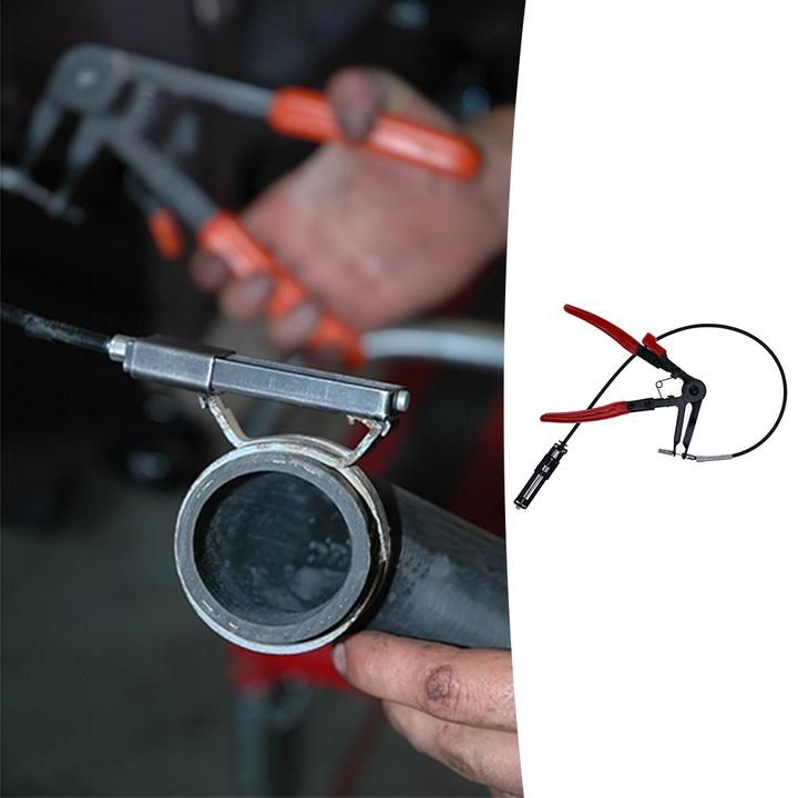 Клещи для самозажимных хомутов c гибким захватом используются для работы с многоразовыми самозажимными пружинными хомутами, которые используются в топливных магистралях и в системах охлаждения двигателя. С дистанционным управлением, обеспечивают доступ к самым труднодоступным хомутам. Фиксирующий механизм с пятью положениями позволяет зафиксировать хомут в разжатом состоянии. Профессиональный съемник хомутов с гибким приводом VAS 6340.
