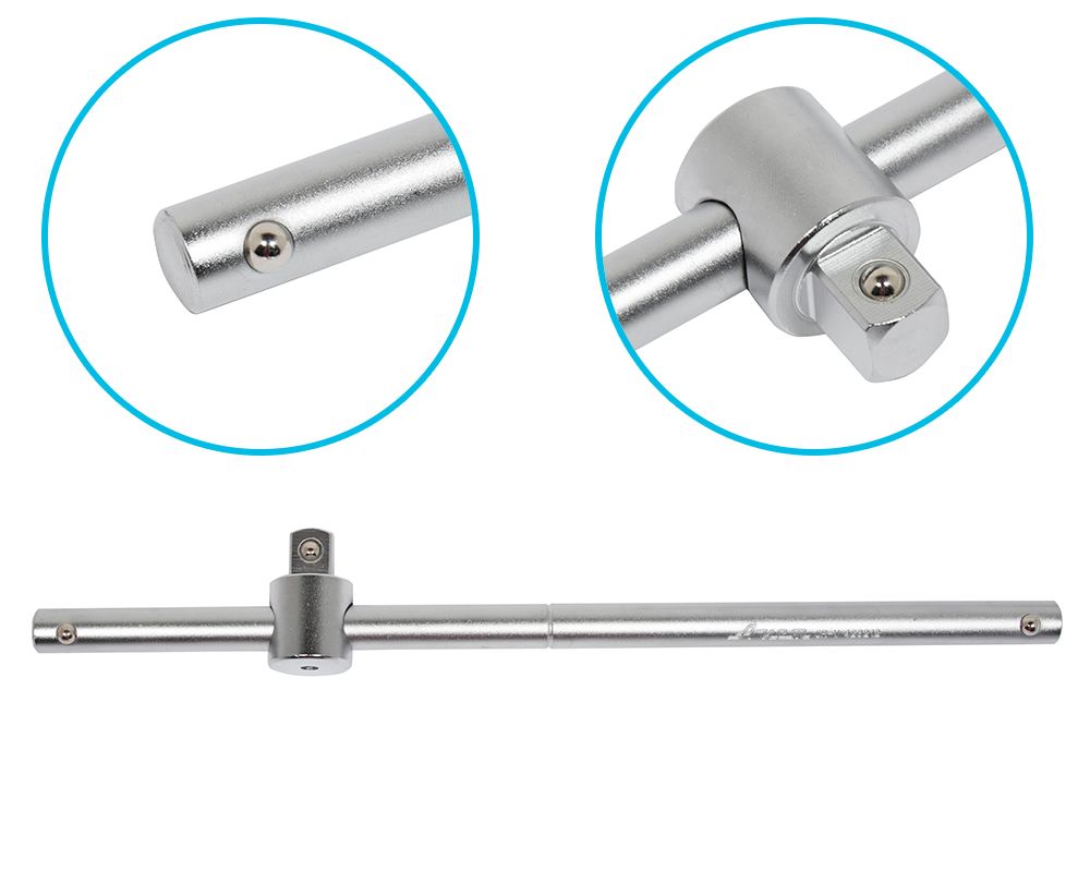 Вороток Т-образный скользящий с бегунком под торцевые головки 1/2" дюйма необходим для передачи крутящего момента на торцевые головки. Наличие присоединительного квадрата 1/2" дюйма позволяет использовать с ключом большие торцевые головки соответствующего присоединительного размера. Специальные паз в середине воротка дает возможность зафиксировать бегунок в данном положении.