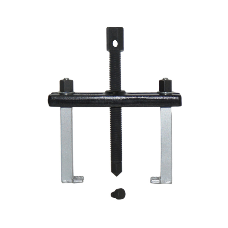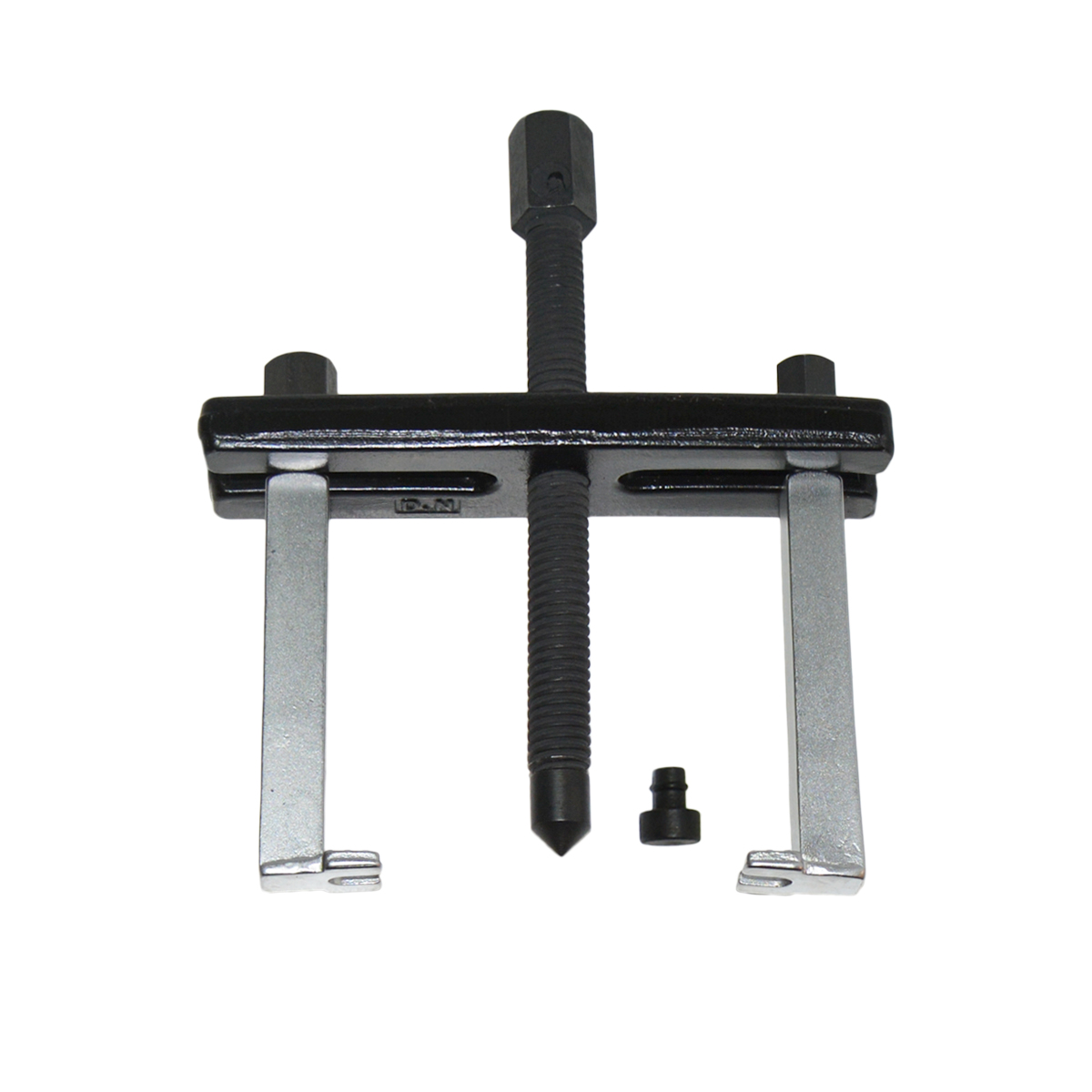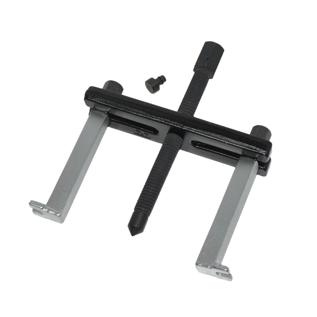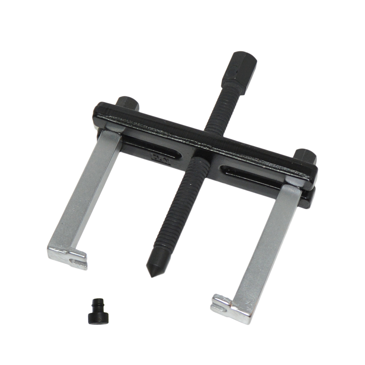Съемник подшипников двухлапый предназначен для демонтажа деталей, запрессованных в обойму или установленных на вал. Используется для снятия подшипников с различными внешними диаметрами. Так же применяется для демонтажа шкивов, шестерен с захватом за внешнюю часть детали, и где это необходимо и возможно технологически, за внутреннюю часть, переустановив захваты. Съемник подшипников 2-ух захватный имеет ширину захватов деталей от 30 до 140 мм. Конструкция двухзахватного съемника подшипников позволяет регулировать как ширину захвата, так и глубину. Съемник подшипников с двумя захватами может применяться как для внешнего, так и для внутреннего демонтажа. Силовой болт имеет 2-е сменные насадки: конусная и плоская круглая.