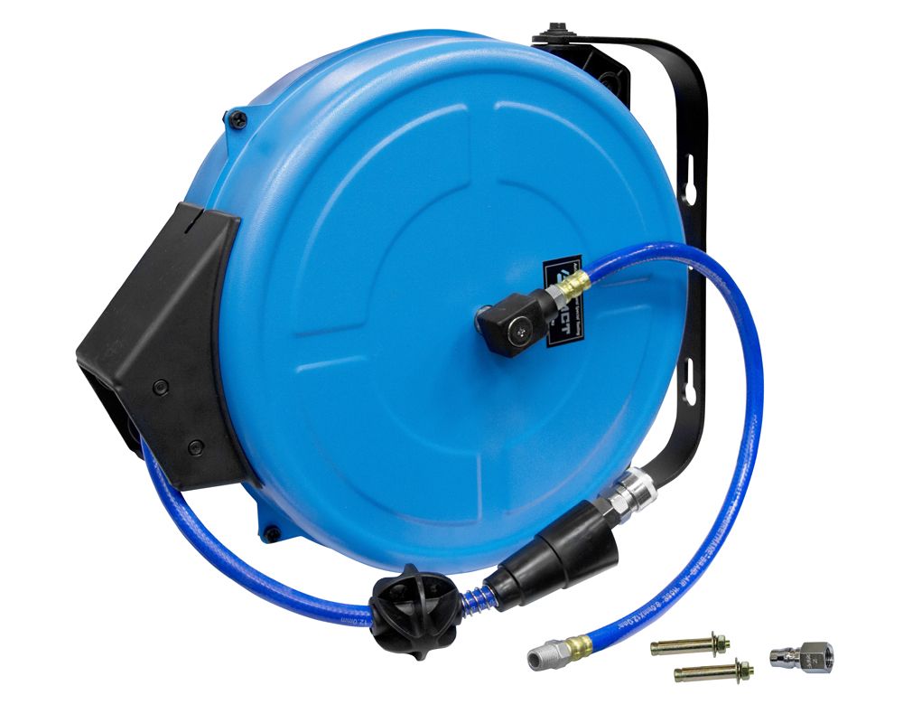 Катушка со шлангом для воздуха используется для соединения воздушно-компрессорного оборудования и пневматических инструментов. Пневмошлаг для сжатого воздуха имеет длину 15 метров, внешний диаметр 12мм, внутренний диаметр 8мм и резьбовые соединения 1/4' дюйма. Катушка имеет возвратный механизм шланга. Крепления позволяют использовать катушку, как для настенного, так и для потолочного монтажа. В комплекте идут быстросъемные штуцера.