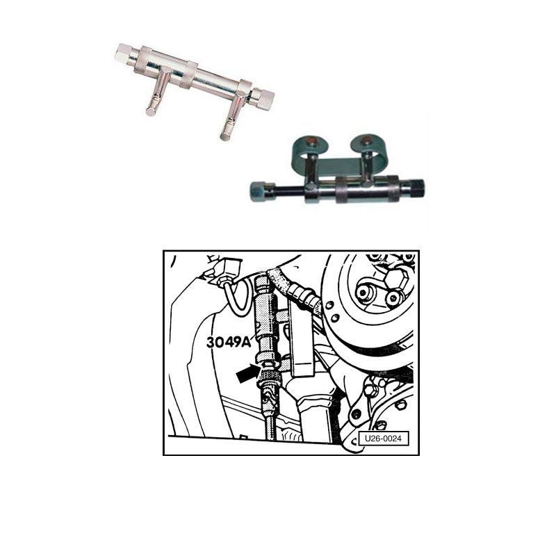 Инструмент VW 3049A используется для демонтажа пружинной скобы крепления приемной трубы глушителя. Съемник скоб глушителя 3049А используется при ремонте двигателей 1.6, 1.9 и других VAG. Профессиональный съемник скобы глушителя Фольксваген.