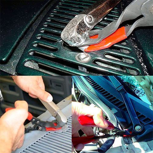 Инструмент снимает рычаги стеклоочистителя с большинства автомобилей. Защитная накладка на нижней части не поцарапает окрашенные поверхности. Поместите губки между рычагом стеклоочистителя и валом, а затем сожмите ручки, чтобы снять дворник.