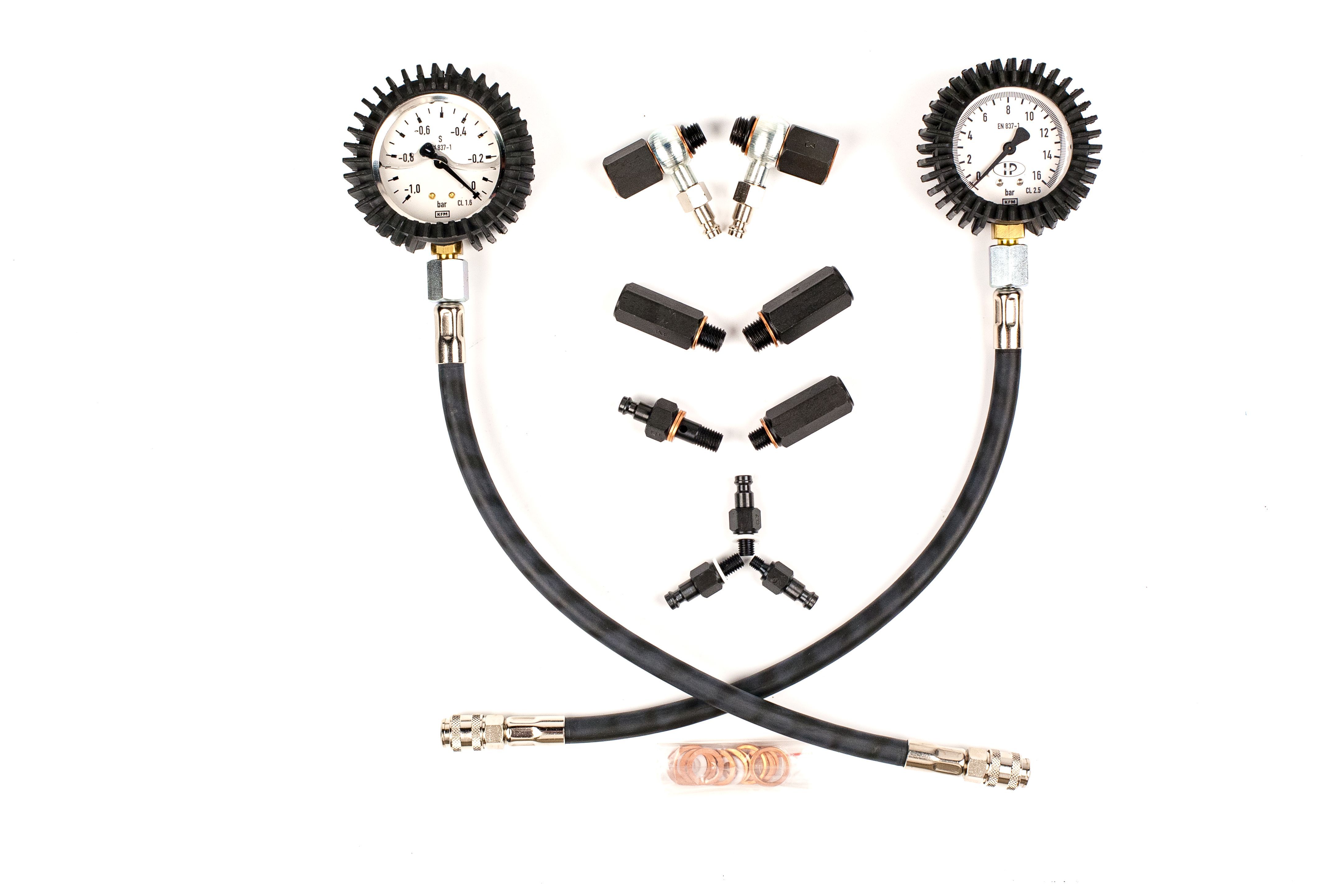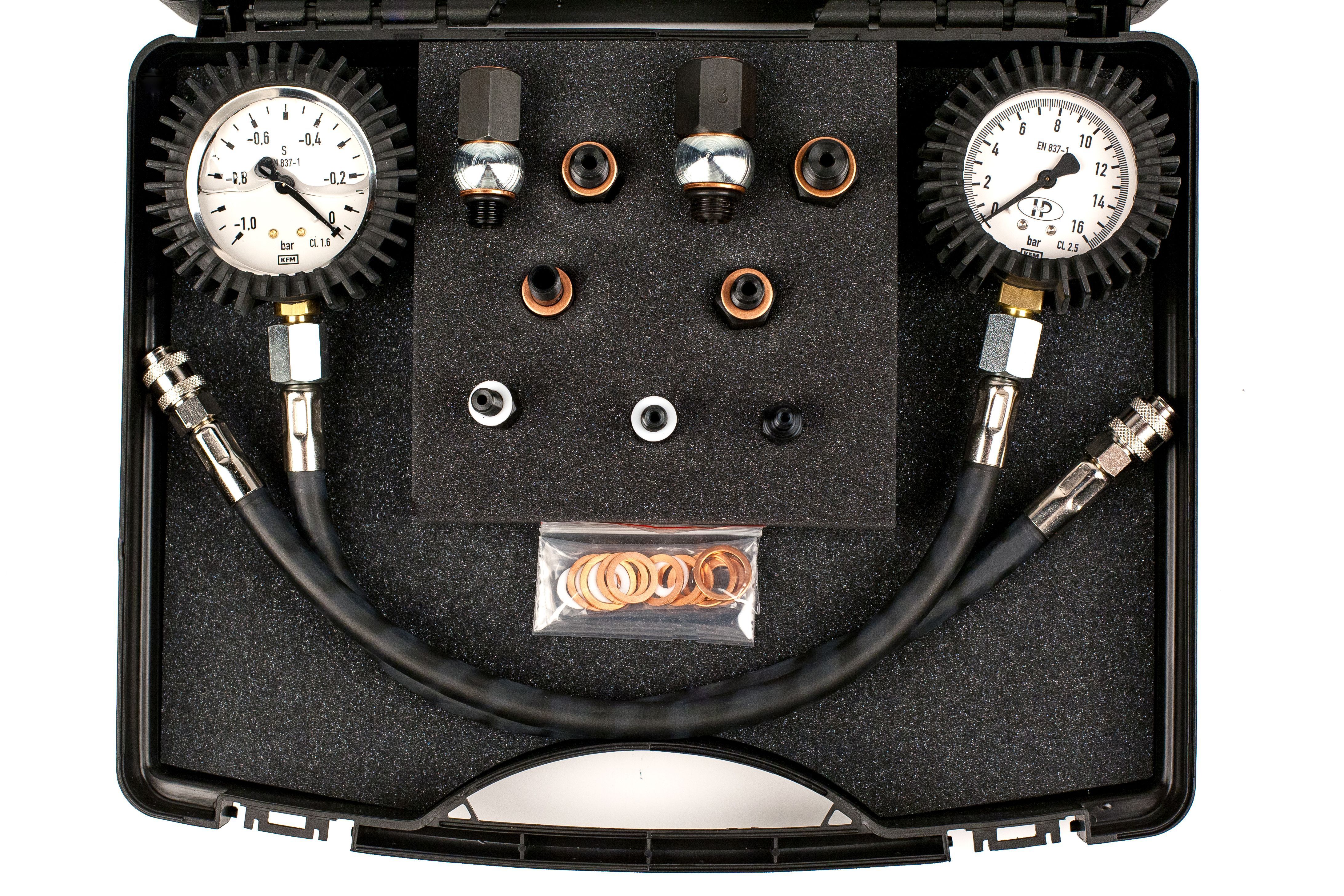 Набор предназначен для измерения разряжения в обратной магистрали топливного насоса высокого давления, а так же внутрикорпусного давления Bosch VE, Lucas DPC, DPA. В набор включены все необходимые переходники для данного типа ТНВД, а также манометр (диапазон измерения 0-16 Бар) и вакуумметр (диапазон измерения 0-1 Бар).