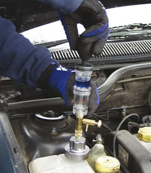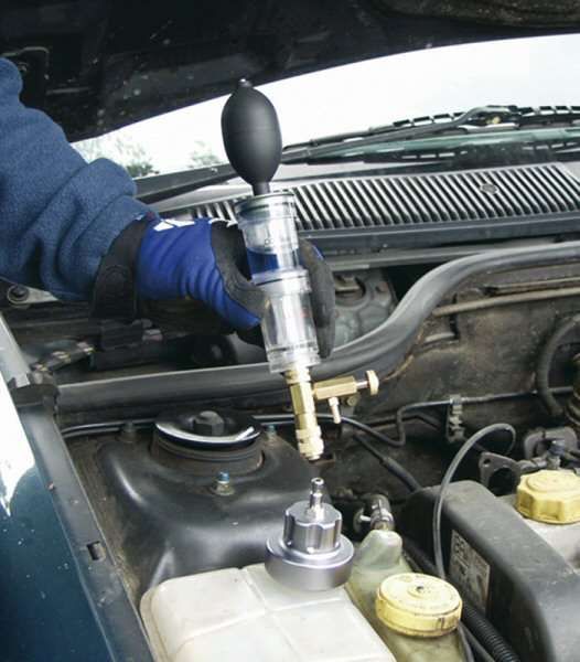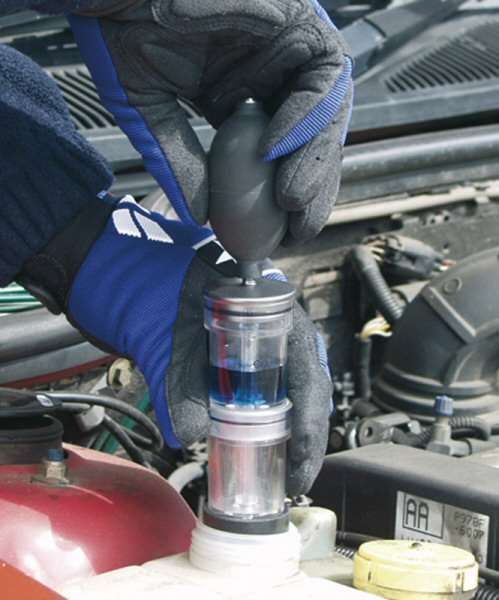 - Тестер вставляется в заливную горловину бачка охлаждающей жидкости и грушей выкачивает воздух из бачка;