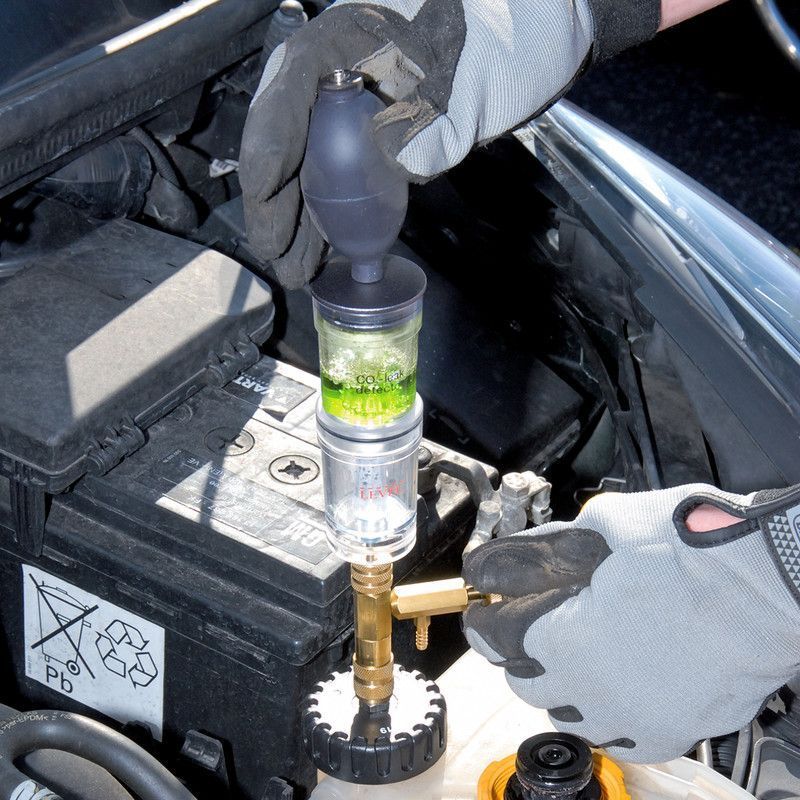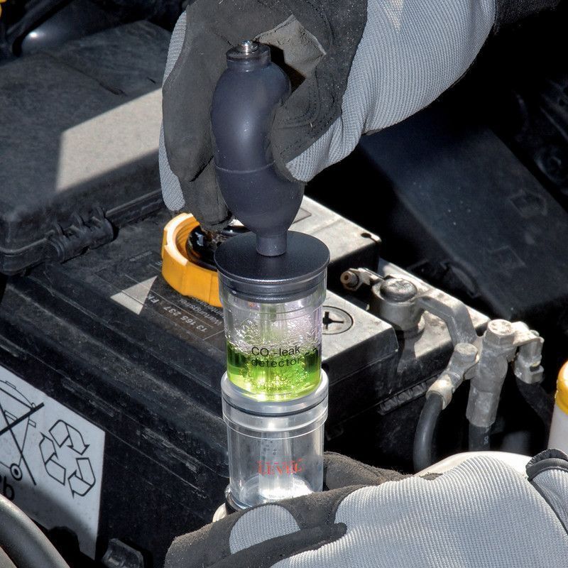 Проверка осуществляется во время работы двигателя на холостом ходу. Показателем неисправности служит смена цвета контрольной жидкости. Если в течение минуты проверки жидкость становится желтой (для бензиновых двигателей) и зеленой (для дизельных двигателей), то продукты сгорания попадают в рубашку охлаждения ДВС.