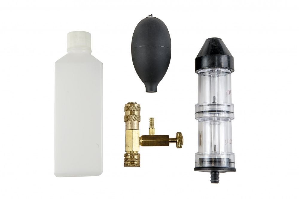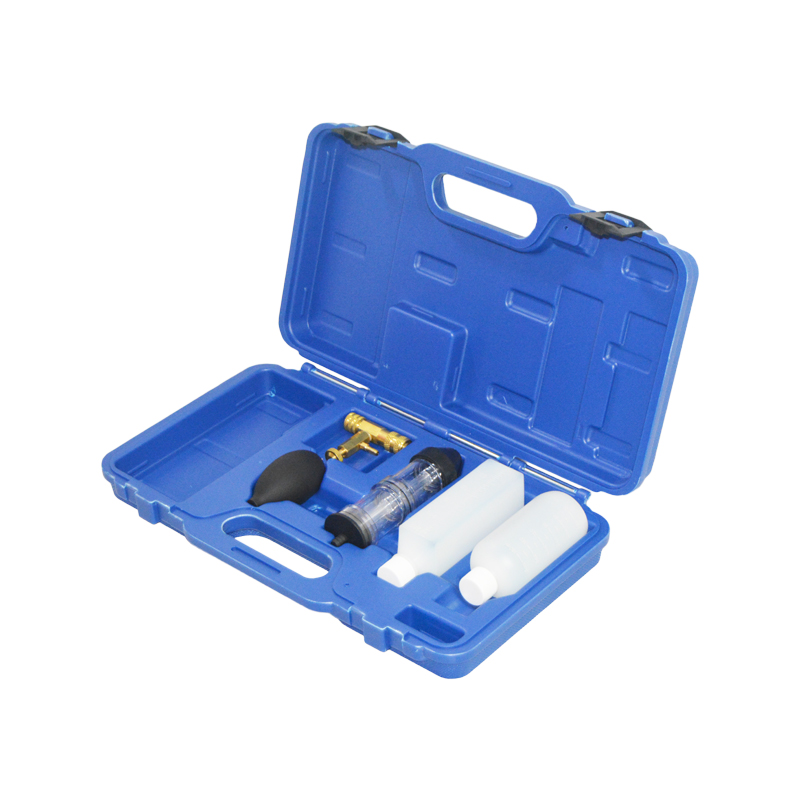 Набор представляет собой диагностическое устройство, с помощью которого можно определить содержания выхлопных газов в охлаждающей жидкости системы охлаждения двигателя автомобиля. Обычно утечка продуктов сгорания происходит через перекосы головки цилиндра, поврежденные прокладки или трещины в блоке цилиндров. Профессиональный тестер выхлопных газов в системе охлаждения.