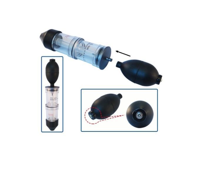 - Частицы щелочи могут нейтрализовать эффект присутствия CO2, показывая что утечки нет, когда она присутствует. Эти частицы абсорбируются первой камерой тестера, которая действует как фильтр, позволяя только воздуху и CO2 достигать второй — верхней камеры тестера;