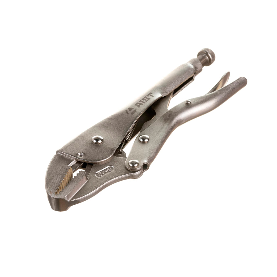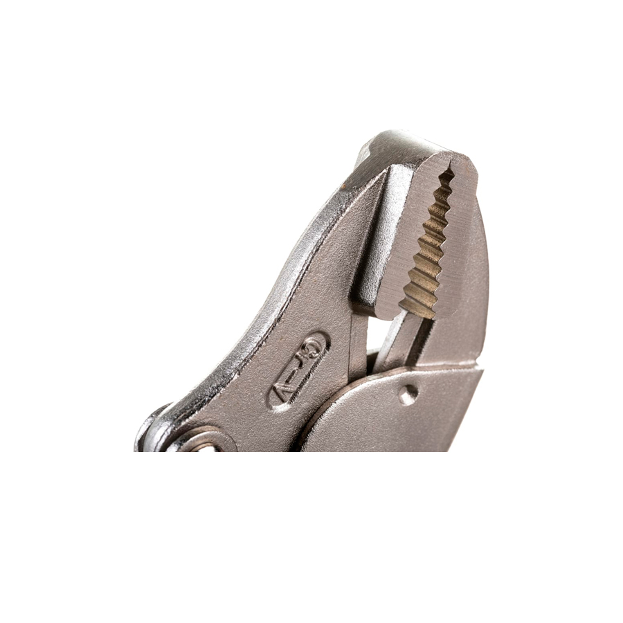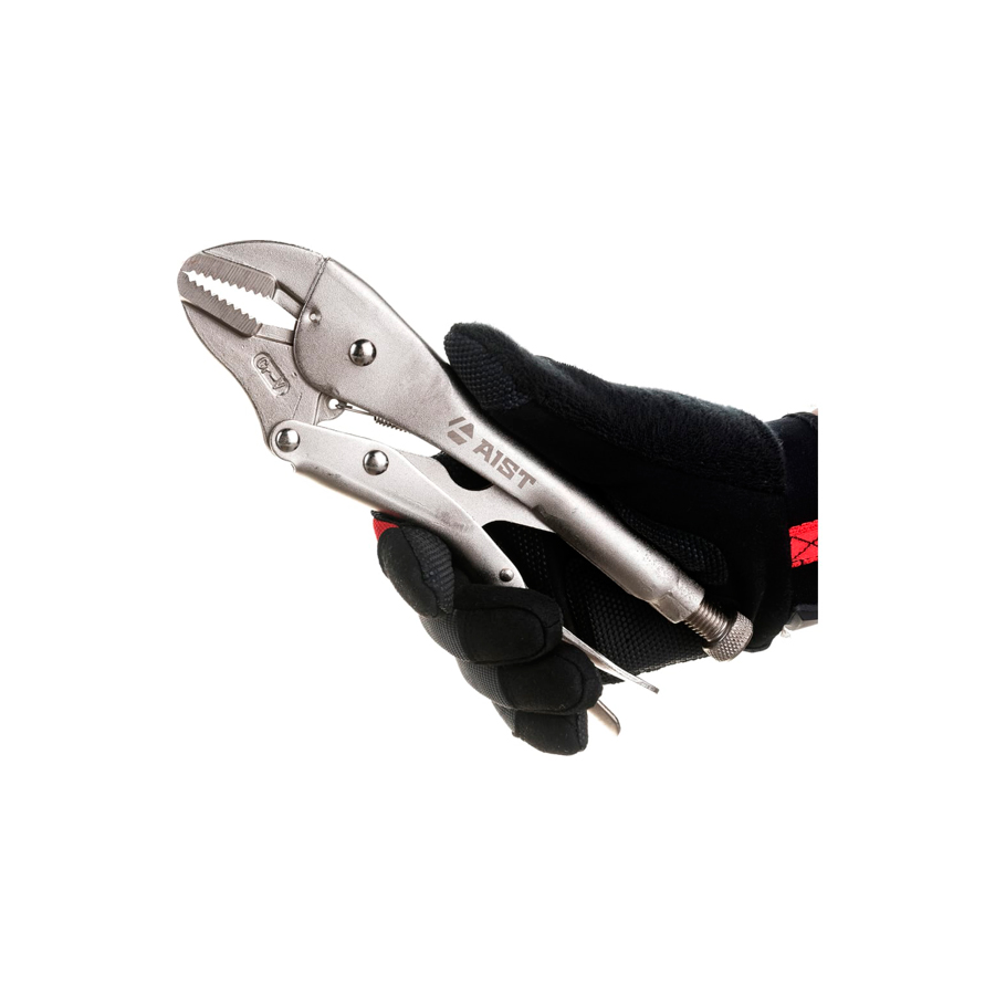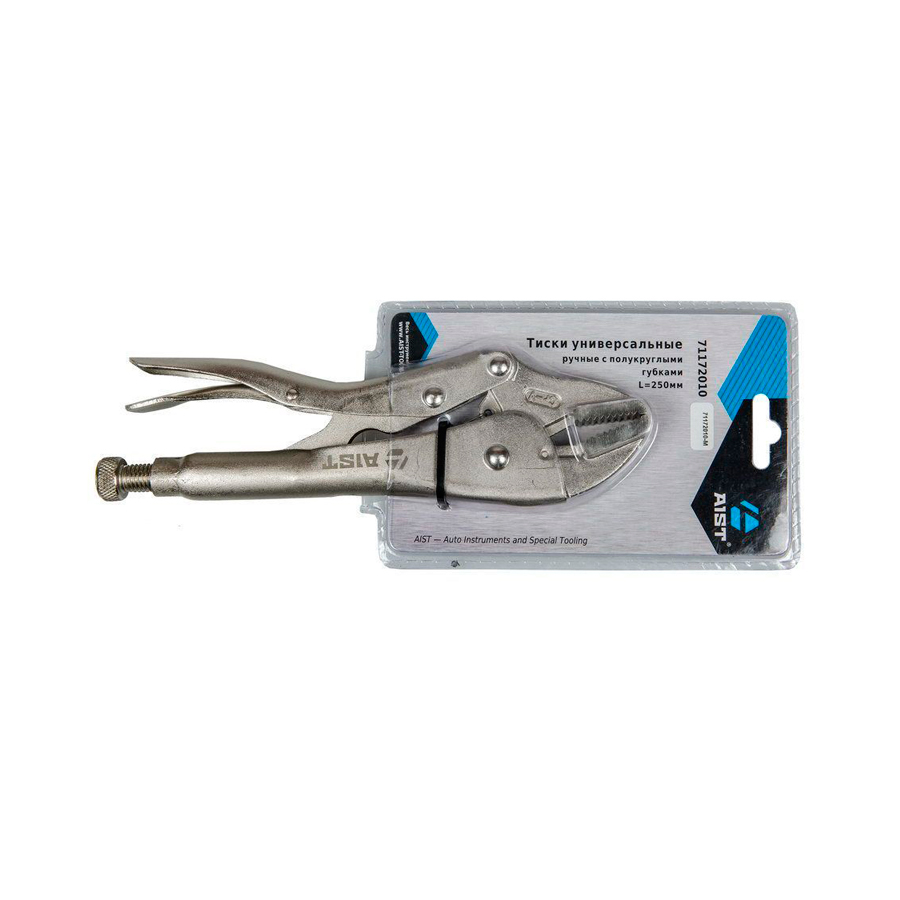 Регулируемые универсальные ручные тиски с прямым захватом. Ручной зажим (зажимные клещи) с фиксатором и прямыми губками 250мм используется для зажима различных деталей. Зажимные клещи с фиксатором имеют диапазон захвата от 0 до 55 мм. Профессиональный ручной зажим жестянщика. Ручные тиски (струбцина) имеют винтовой фиксатор. Ручной зажим (клещи) изготовлены из хромованадиевой стали и имеют никелированное покрытие, которое защищает от коррозии. Кованые рабочие поверхности губок тисков типа "собака" закалены ТВЧ. Зажим (захват) гейферный с фиксацией и с рычагом быстрого освобождения.