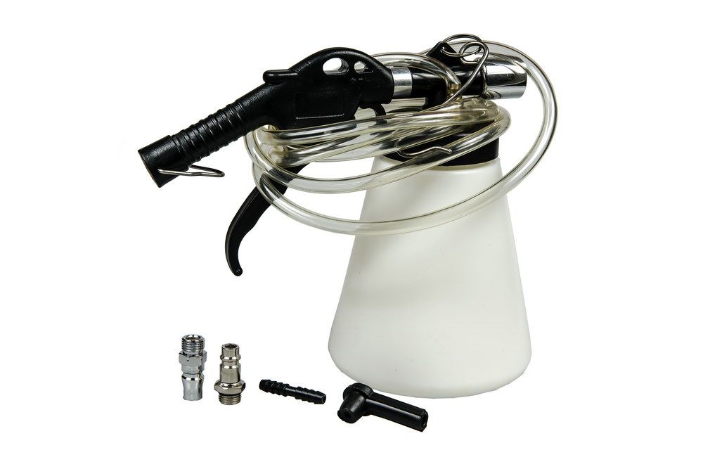 Емкость для вакуумной замены тормозной жидкости 1 литр в тормозной системе и сцепления абсолютно любых автомобилей. Устройство можно использовать при замене старой тормозной жидкости на новую, как на автомобилях с ABS так и без нее. Устройство можно использовать как функциональный аналог VAS 5226 для удаления топлива из топливной системы. Может быть перменимо для откачивания различных технических жидкостей.