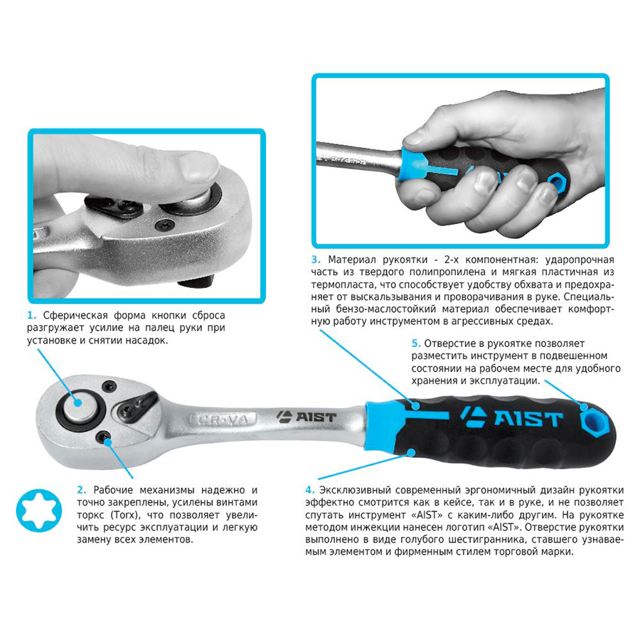 Помимо качества и надежности рабочих материалов «AIST» уделяет большое внимание вопросу удобства и безопасности использования инструмента. Непрерывная работа в профессиональной деятельности всегда приносит усталость и мышечное напряжение. Для ручного инструмента специалистами компании «AIST» были разработаны современные рукоятки эргономичной формы, которые повторяют контур пальцев кисти руки, обеспечивая надежный захват и предотвращая неудобство и возможные повреждения конечности.
