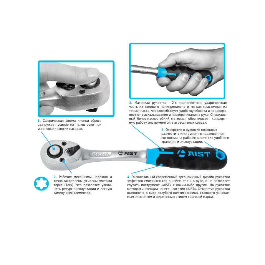Помимо качества и надежности рабочих материалов «AIST» уделяет большое внимание вопросу удобства и безопасности использования инструмента. Непрерывная работа в профессиональной деятельности всегда приносит усталость и мышечное напряжение. Для ручного инструмента специалистами компании «AIST» были разработаны современные рукоятки эргономичной формы, которые повторяют контур пальцев кисти руки, обеспечивая надежный захват и предотвращая неудобство и возможные повреждения конечности.