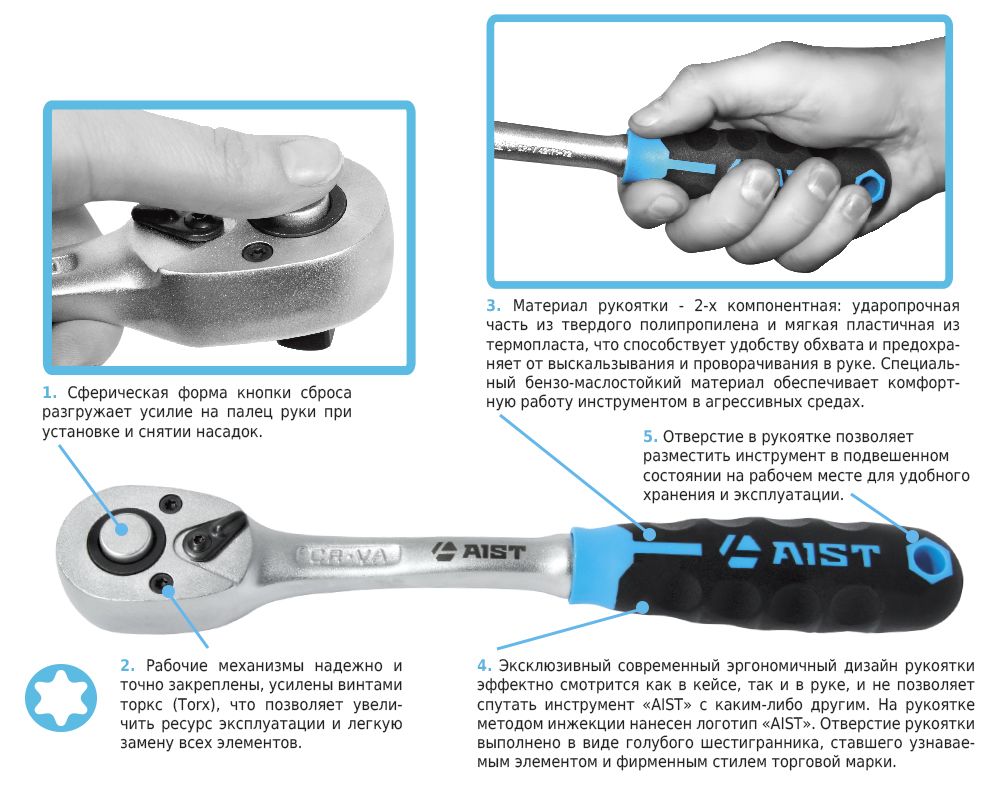 Помимо качества и надежности рабочих материалов «AIST» уделяет большое внимание вопросу удобства и безопасности использования инструмента. Непрерывная работа в профессиональной деятельности всегда приносит усталость и мышечное напряжение. Для ручного инструмента специалистами компании «AIST» были разработаны современные рукоятки эргономичной формы, которые повторяют контур пальцев кисти руки, обеспечивая надежный захват и предотвращая неудобство и возможные повреждения конечности.