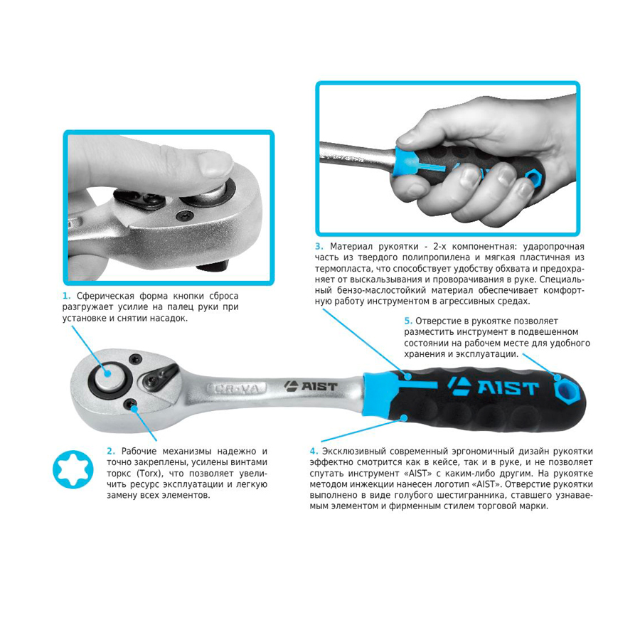 Помимо качества и надежности рабочих материалов «AIST» уделяет большое внимание вопросу удобства и безопасности использования инструмента. Непрерывная работа в профессиональной деятельности всегда приносит усталость и мышечное напряжение. Для ручного инструмента специалистами компании «AIST» были разработаны современные рукоятки эргономичной формы, которые повторяют контур пальцев кисти руки, обеспечивая надежный захват и предотвращая неудобство и возможные повреждения конечности.