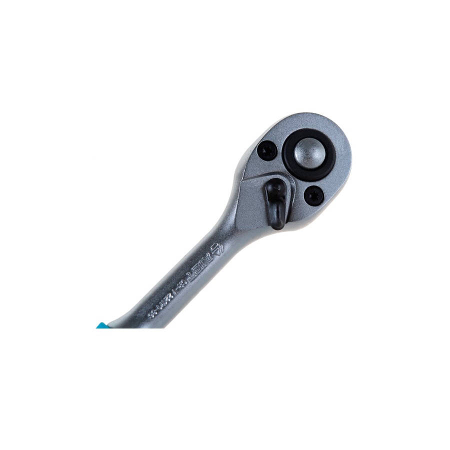 Трещетка для головок 1/4. Используется ключ трещетка 1/4 для головок и вместе с другим сборно-монтажным инструментом соответствующего посадочного квадрата. Инструмент трещотка (трещоточная рукоятка) имеет храповый механизм на 36 зубов (силовая), флажковый переключатель рабочего направления, шариковую фиксацию и кнопку сброса. Трещотка для головок оснащена двухкомпонентной маслобензостойкой рукоятью, которая повторяет контур пальцев кисти рук. Профессиональная трещетка для головок.