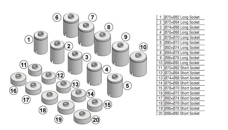 - 10 гильз, L=110мм, диаметром (внеш.)х(внутр.): 77x62, 72x64, 74x66, 76x68, 78x70, 80x72, 82x74, 84x76, 86x78, 88x80мм.