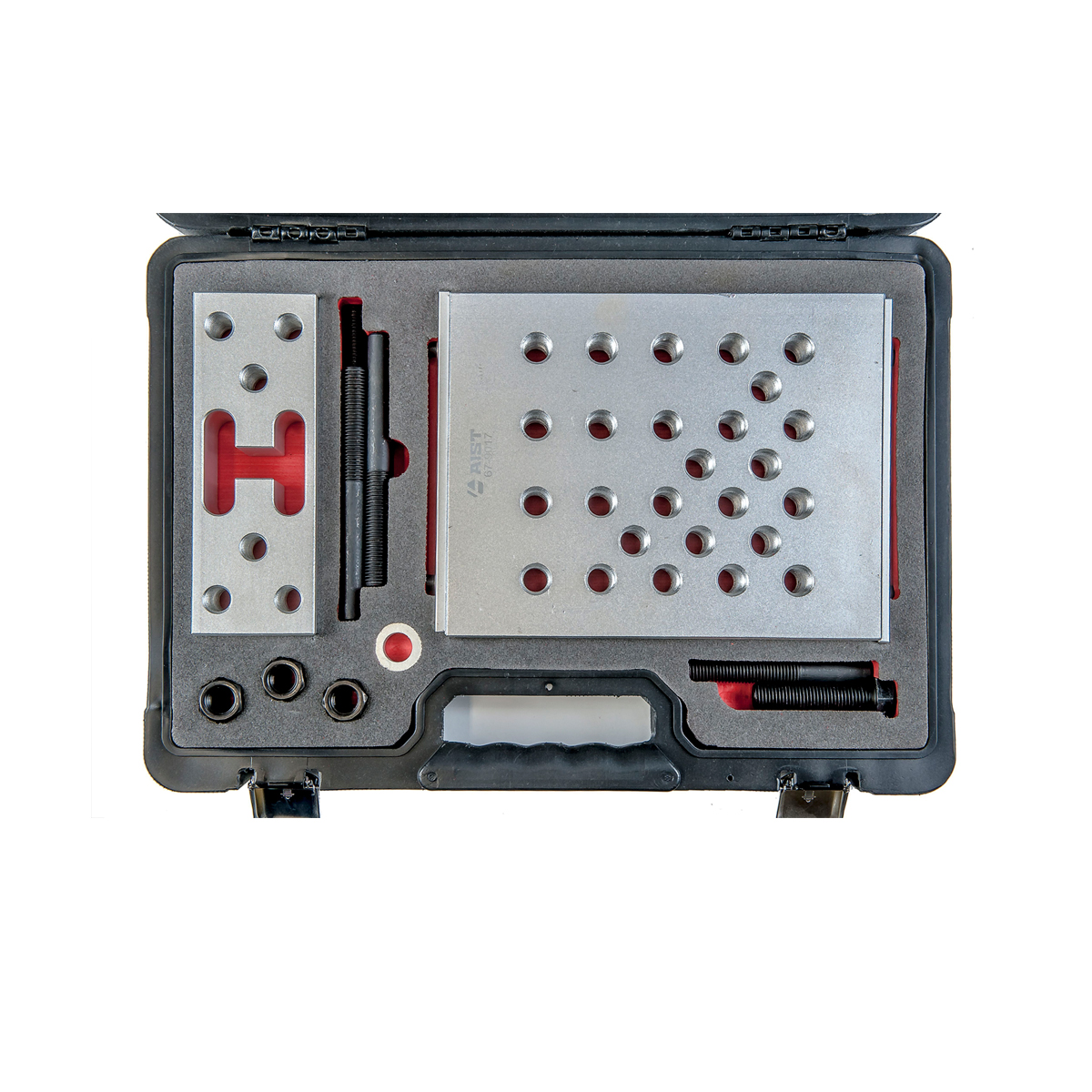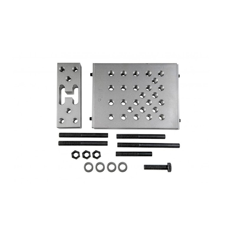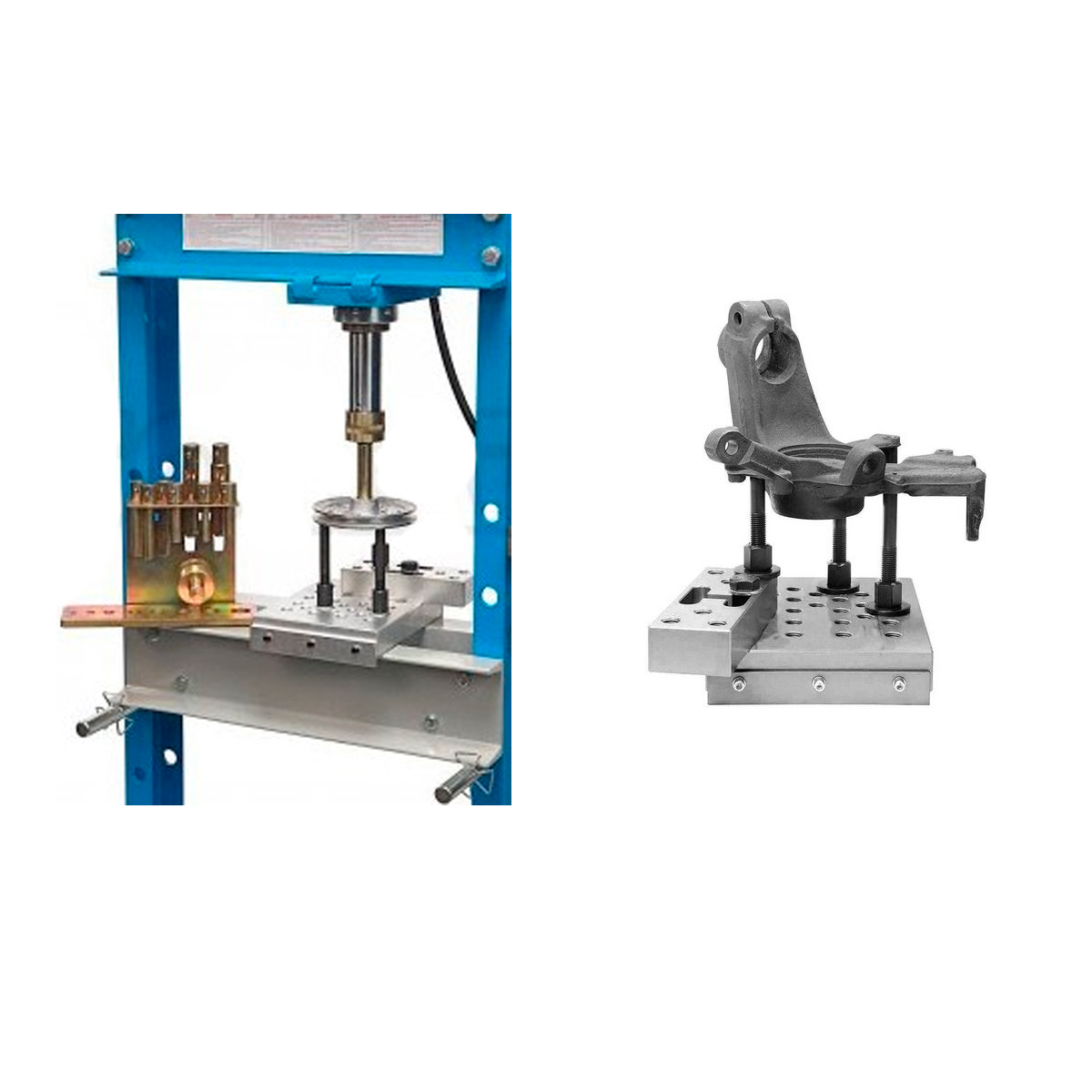 Плита оснастка для пресса универсальная используется в качестве опоры для демонтажа подшипников, сайлентблоков и других деталей из поворотного кулака, рычагов подвески автомобиля, корпуса редуктора, рычагов подвески и т.д. Монтажный блок (опора-подставка) имеет регулируемую трехточечную опору. Приспособление используется в сочетании с гидравлическим прессом. Пластина имеет резьбовые отверстия, в которые могут вкручиваться шпильки на разную высоту, которые упираются в деталь в разных точках. Может применяться с прессами до 30 тонн.
