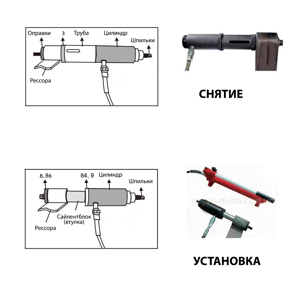 Предназначен для снятия/установки втулок рессоры на грузовых автомобилях при помощи гидравлического привода.
